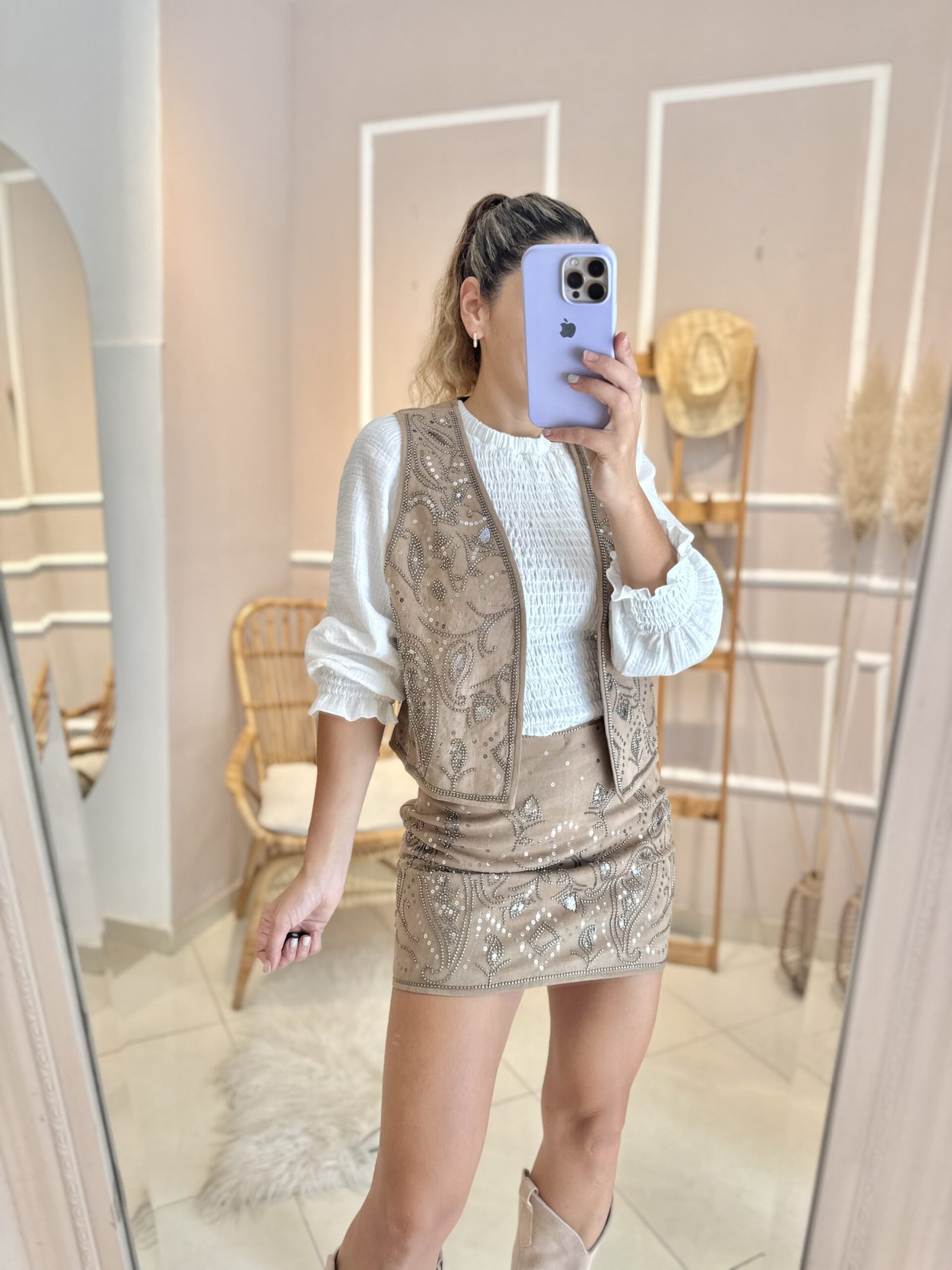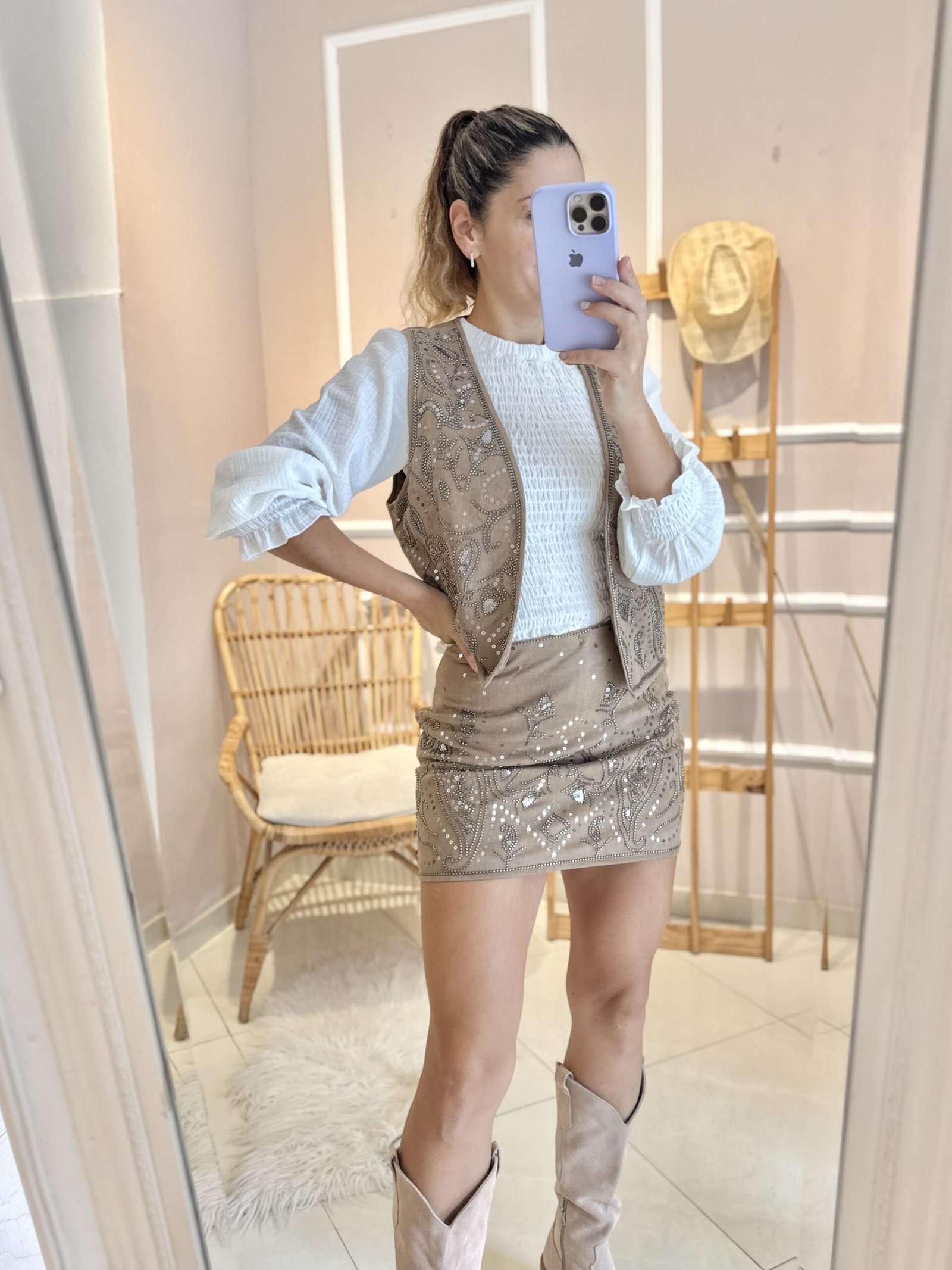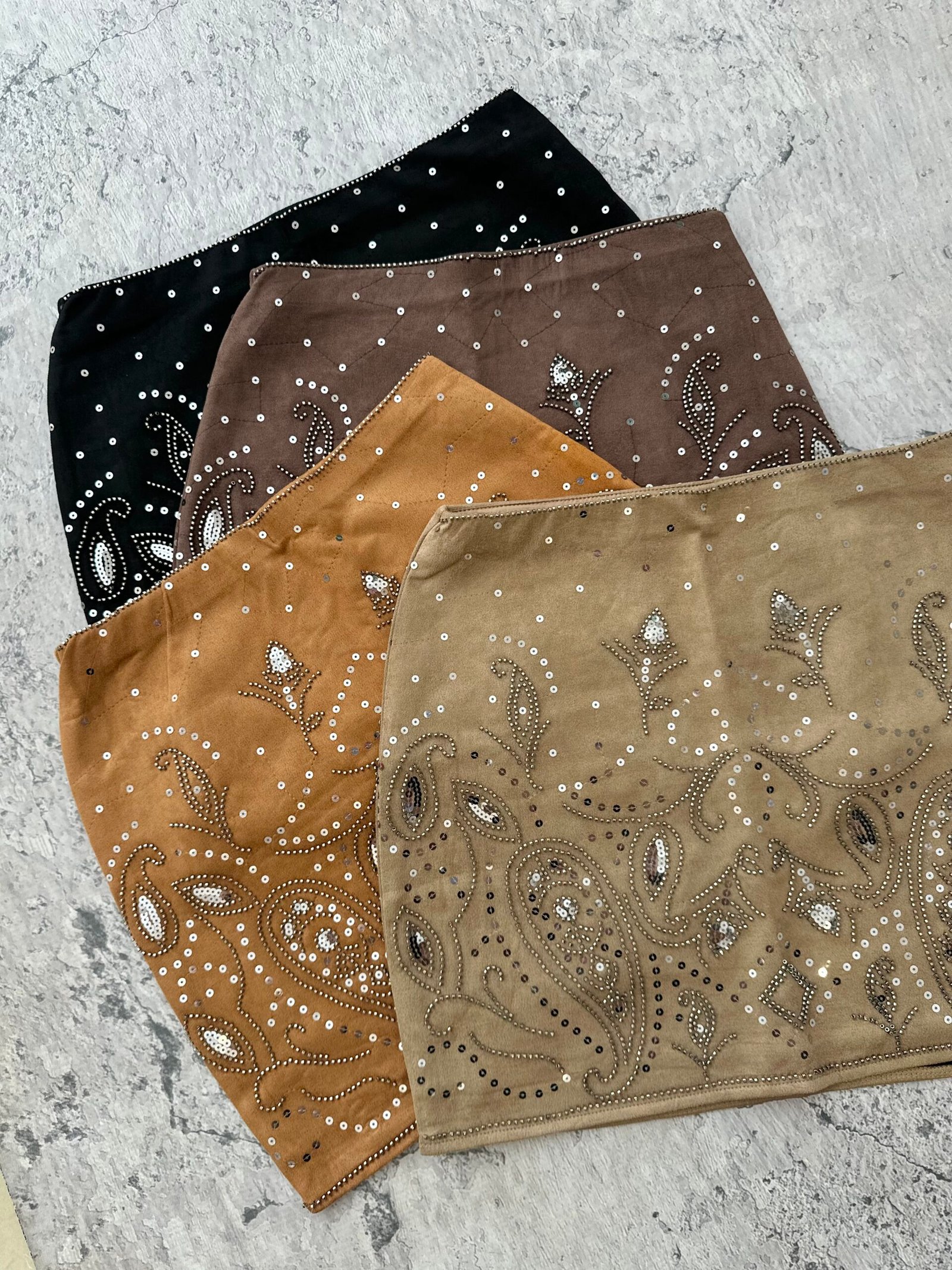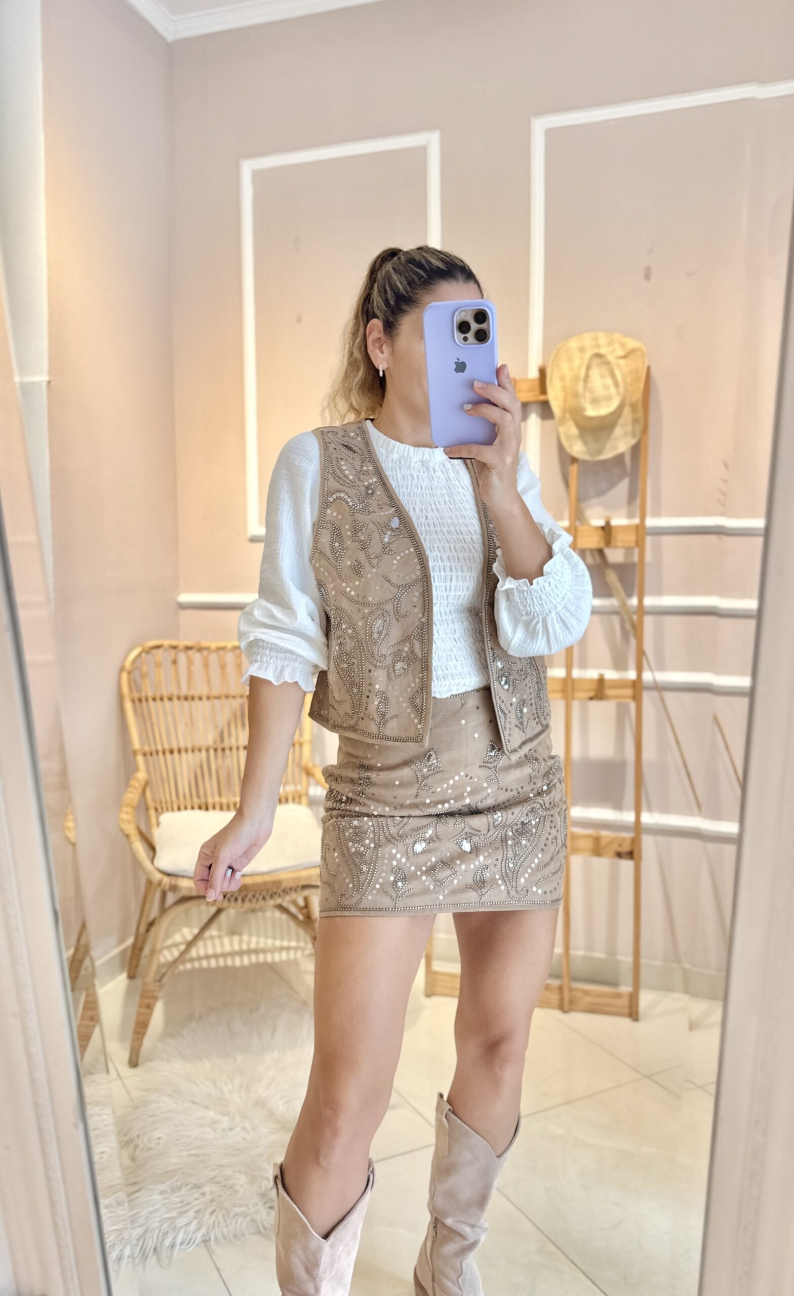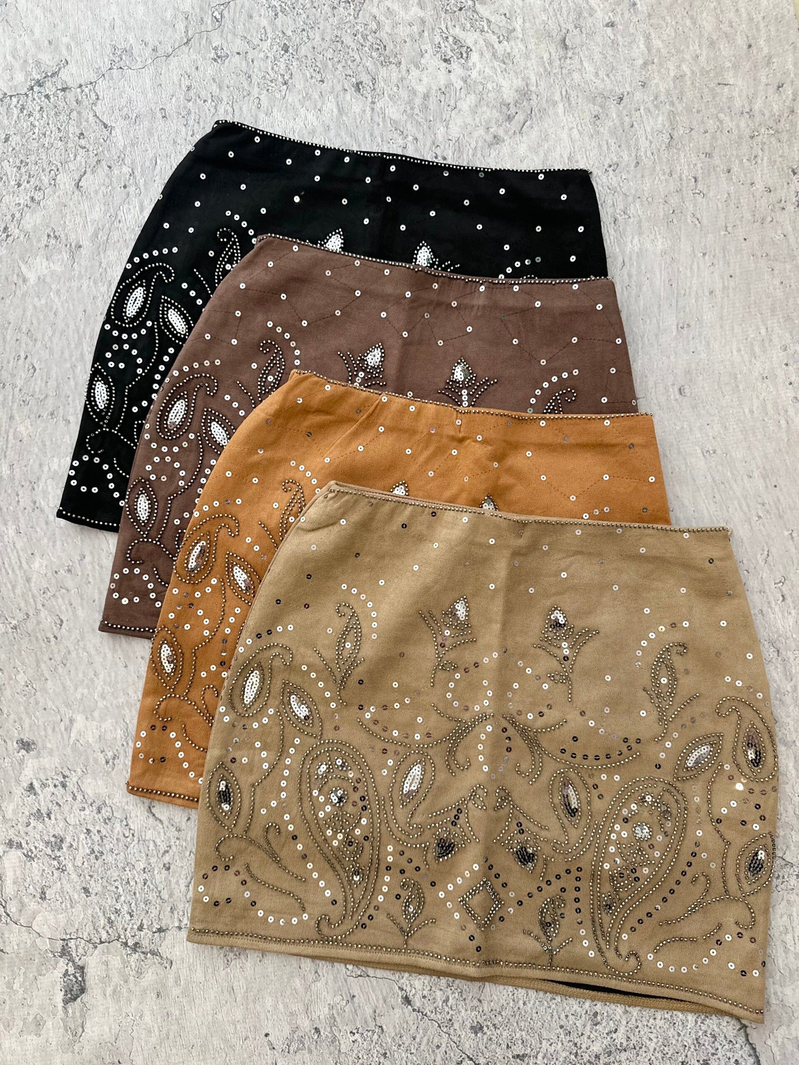 POLLERA  GAMUSA CON FRILLO, VIENE POR TALLE, LA MODELO TIENE M